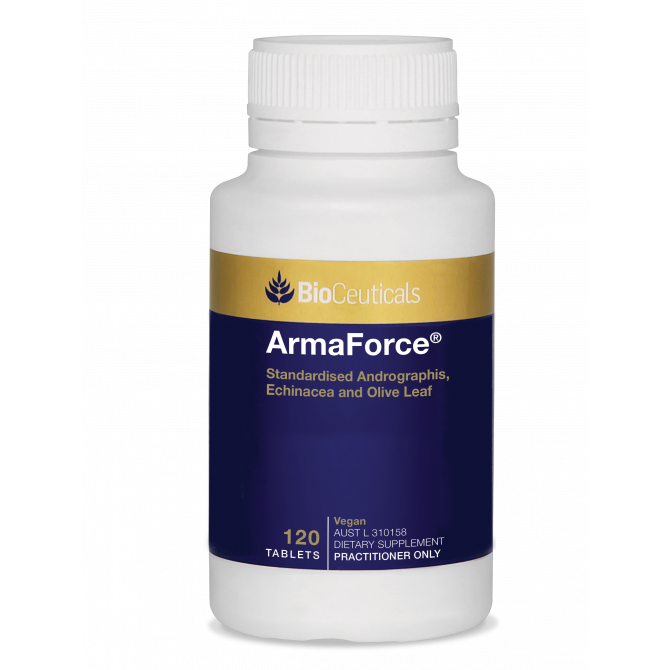 ArmaForce is a comprehensive formula combining the herbal and nutritional ingredients andrographis, echinacea, olive leaf, vitamin C and zinc. It has been scientifically formulated to provide relief of symptoms and decrease the duration of upper respiratory tract infections and colds. ArmaForce supplies nutritional support for healthy immune function.
