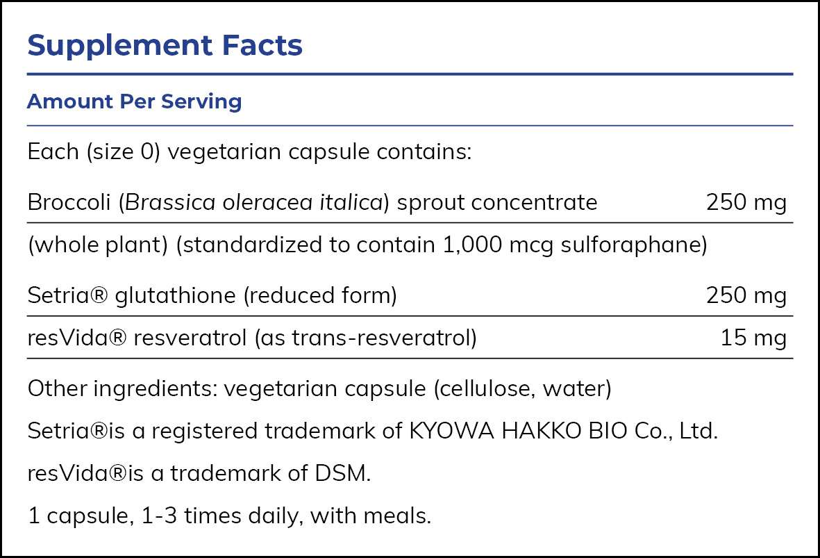 hydrolyzed. The isothiocyanate sulforaphane is one of the most effective activators of phase II detoxification, which occurs primarily in the gut the liver. Sulforaphane and resveratrol promote the activity of nuclear factor erythroid 2-related factor 2 (Nrf2), a transcription factor that supports robust, long-lasting expression of numerous genes responsible for phase II detoxification and protection against oxidative stress. Among these genes are glutathione peroxidase, superoxide dismutase and various phase II enzymes, such as glutathione sulfotransferases. Nrf2 also supports expression of glutathione glutamylcysteinyl ligase, which is responsible for a critical step in the biosynthesis of glutathione, a vital component of cellular antioxidant and detoxification systems.